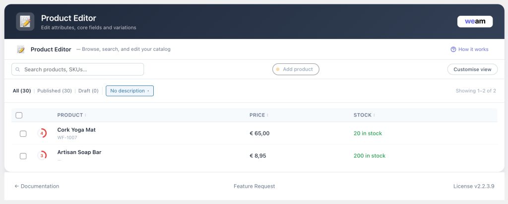 The WooCommerce Classic view of the Products page does what it says and noting more